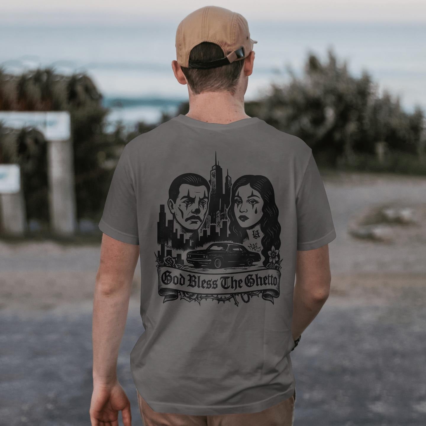 The God Bless the Ghetto tee pays tribute to East LA’s raw roots — the streets, the stories, and the spirit that built a culture. Featuring bold Old English lettering that reads “God Bless the Ghetto,” this piece draws inspiration from Chicano street art, lowrider culture, and the timeless pride of the Eastside.