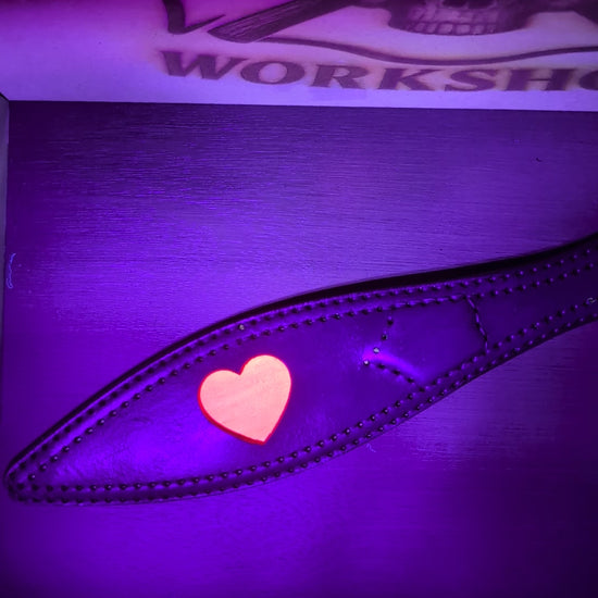 This handmade spanking paddle is crafted from natural veg tan leather, hand-dyed one side in a deep, seductive purple and the other in a bold, jet black. At the center, a heart cut-out is painted with light-activated pink leather paint that glows in the dark—making every swing as striking as the marks it leaves behind.